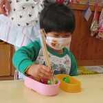 手作りのお箸で上手に握って一つひとつ掴んで運ぶこどもたちでしたよ!