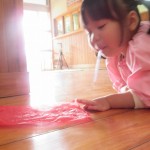 ストロー遊びでは廊下へ移動して花紙を使って、ストローで息を吹き、、、
